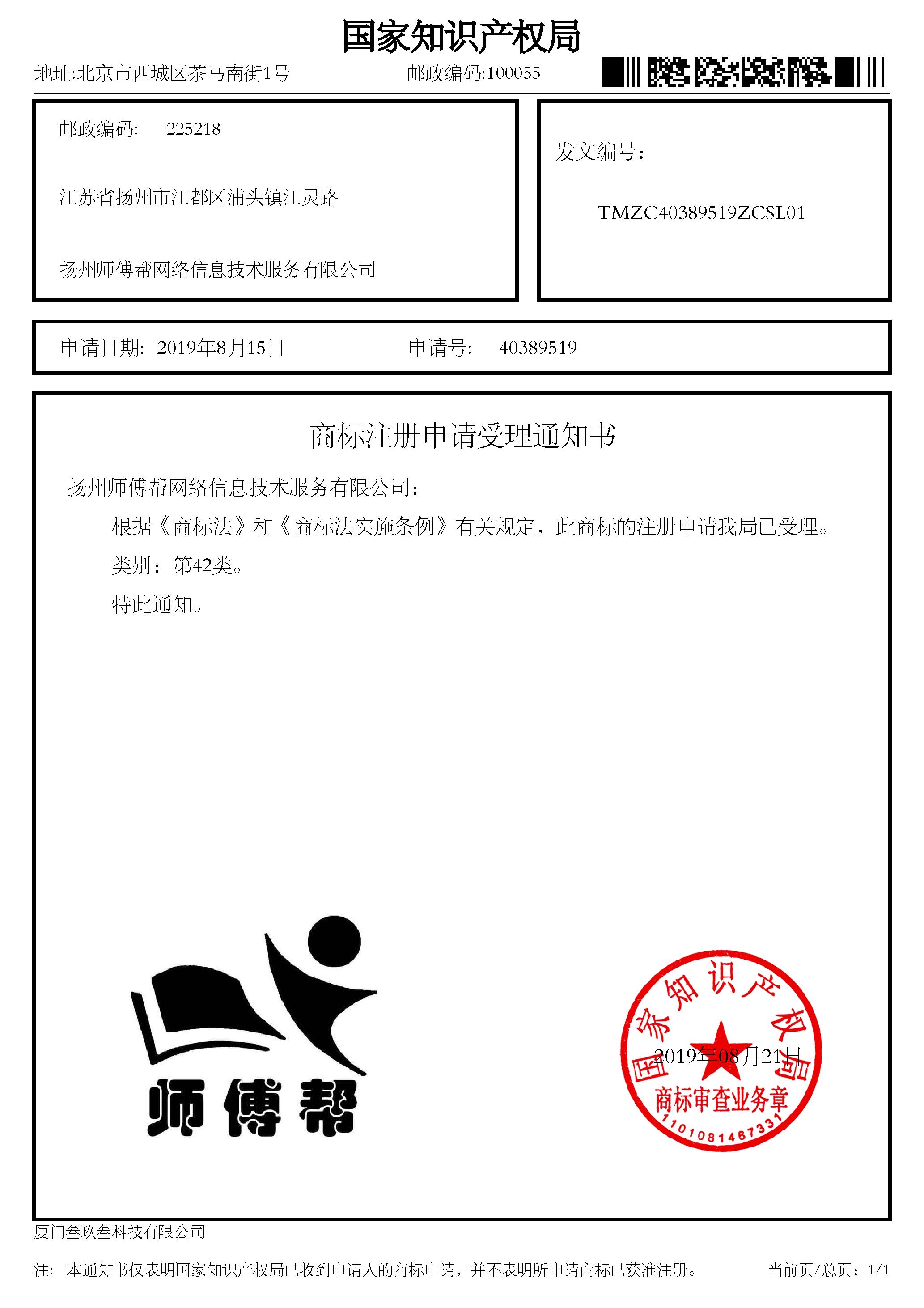 公司师傅帮注册商标通过受理